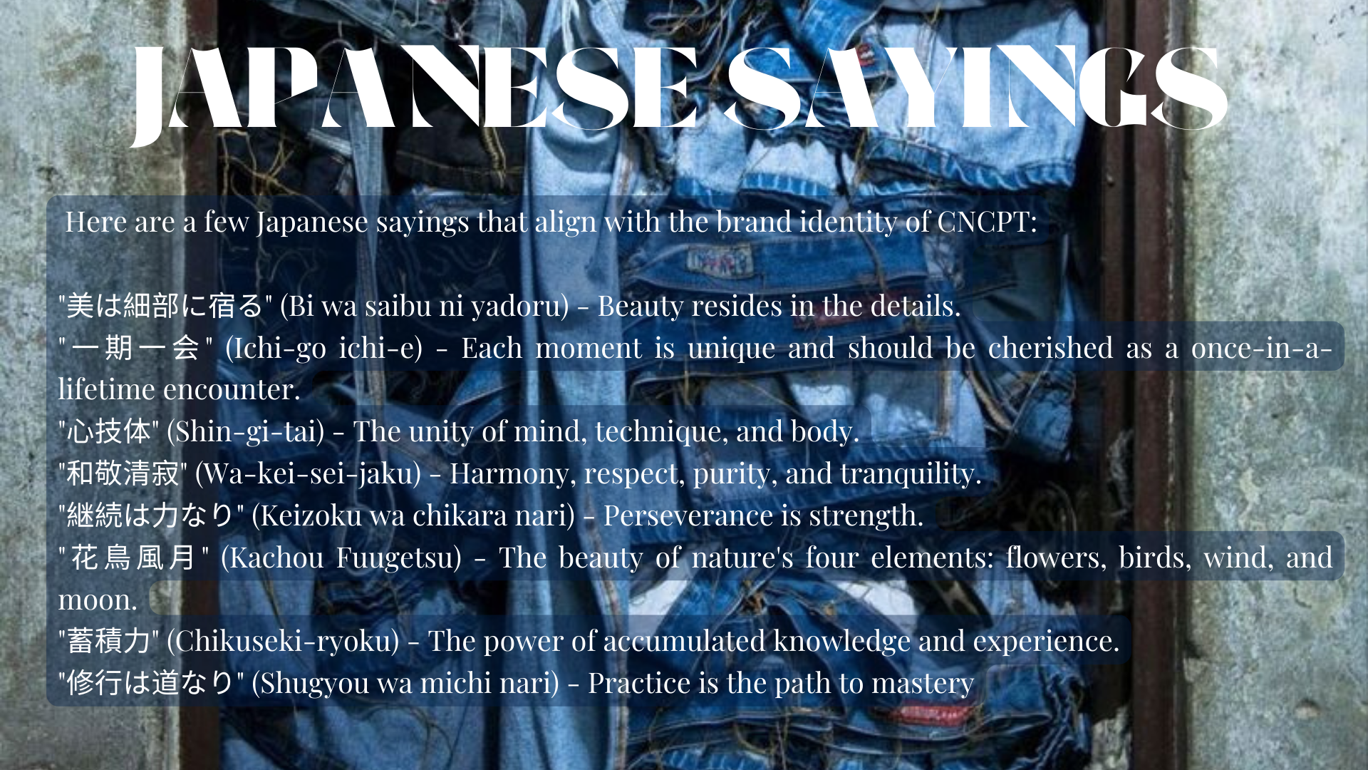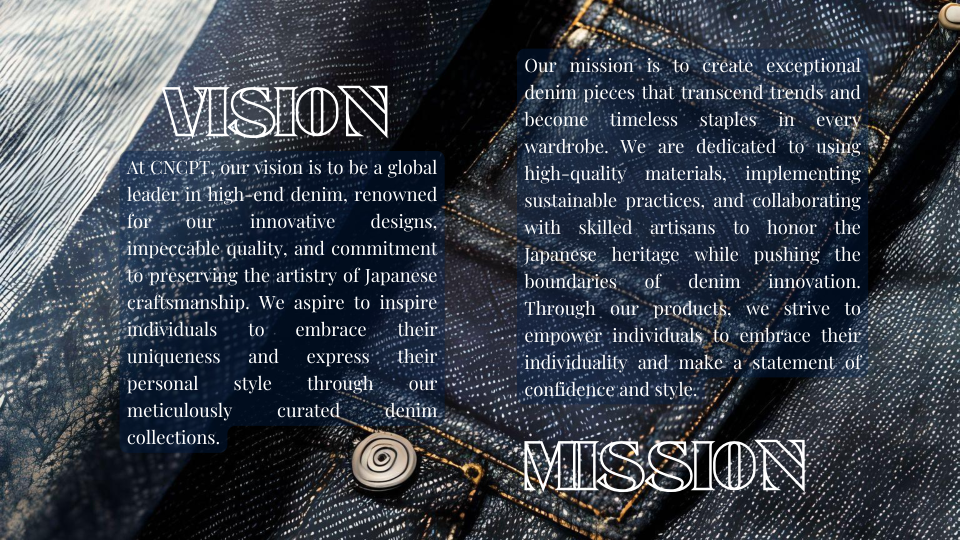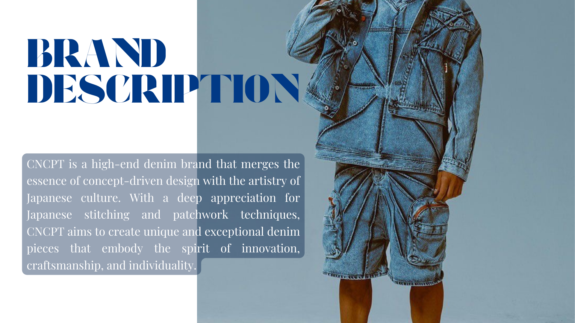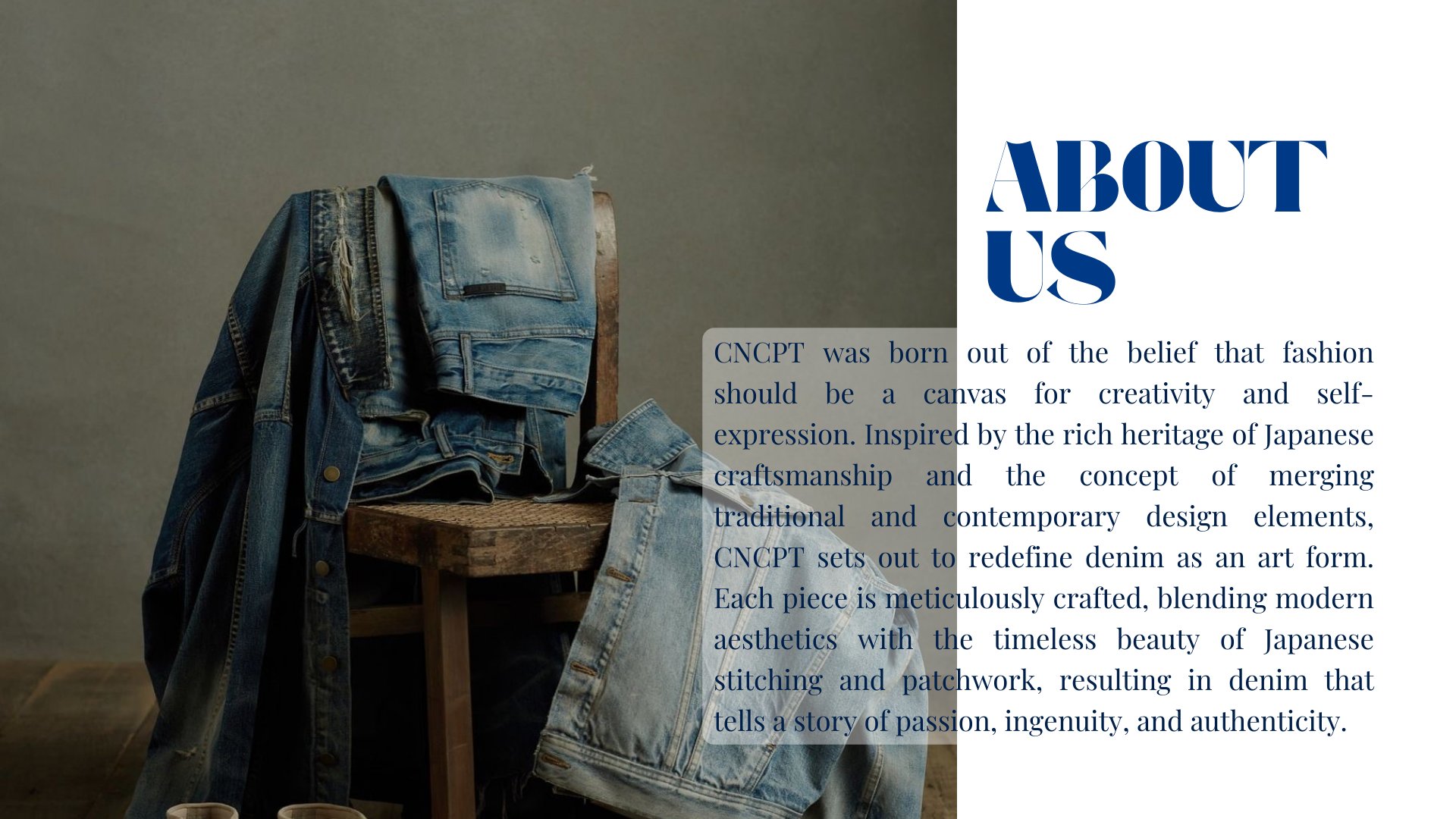 CNCPT is a high-end denim brand that merges the essence of concept-driven design with the artistry of Japanese culture. With a deep appreciation for Japanese stitching and patchwork techniques, CNCPT aims to create unique and exceptional denim pieces that embody the spirit of innovation. craftsmanship, and individuality.